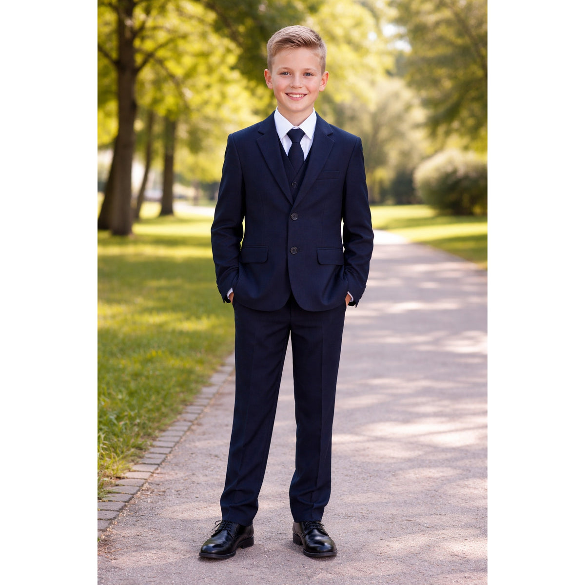 This is a brand new, navy blue formal suit for boys, perfect for special occasions like communions! This handsome 5-piece set includes: