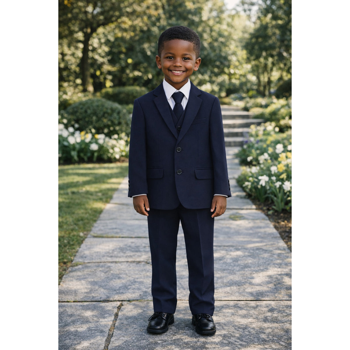 This is a brand new, navy blue formal suit for boys, perfect for special occasions like communions! This handsome 5-piece set includes: